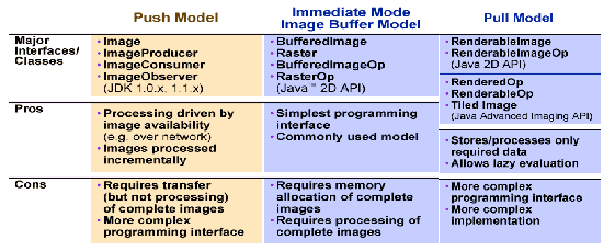 - The pipeline (pull) model compatible with the immediate mode model and that will be fully implemented in the forthcoming Java Advanced Imaging API.