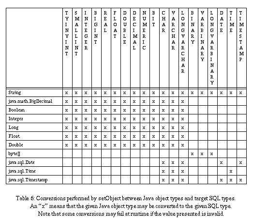 Table 5: Mapping from Java Object types to SQL types.