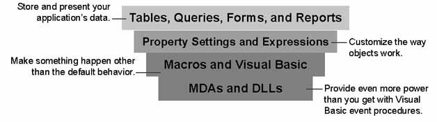 The following illustration shows the building blocks of a Microsoft Access application, starting at the top with the elements you work with most frequently.