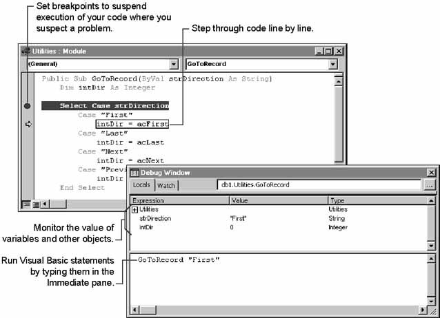 The following illustration points out some of the techniques you can apply by using the debugging tools provided in Microsoft Access.
