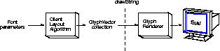 Figure 4-13 and Figure 4-14 illustrate how GlyphVector objects are used by layout mechanisms. Figure 4-13 shows the default layout mechanism. When drawString is called on a String, the built-in layout algorithm: