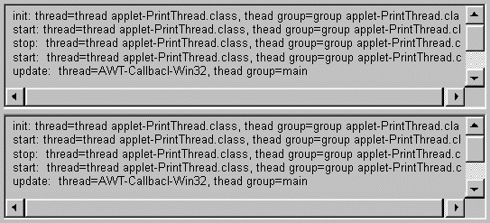 Note: Because some old browsers don't support 1.1, the above applet is a 1.0 version (here is the 1.0 code; here's the 1.1 code). To run the 1.1 version of the applet, go toexample-1dot1/PrintThread.html